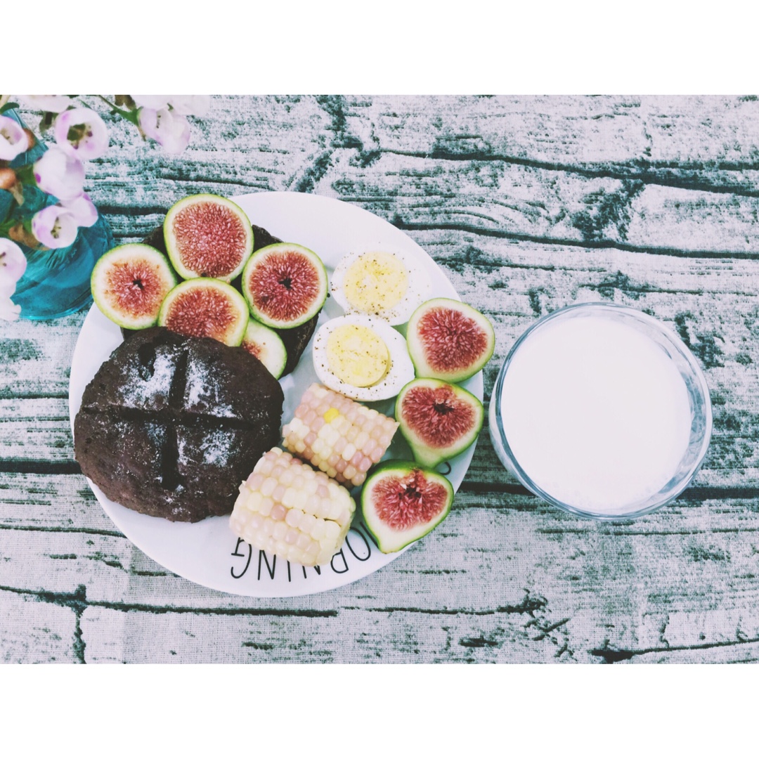 巧克力欧包+无花果+玉米+鸡蛋+牛奶