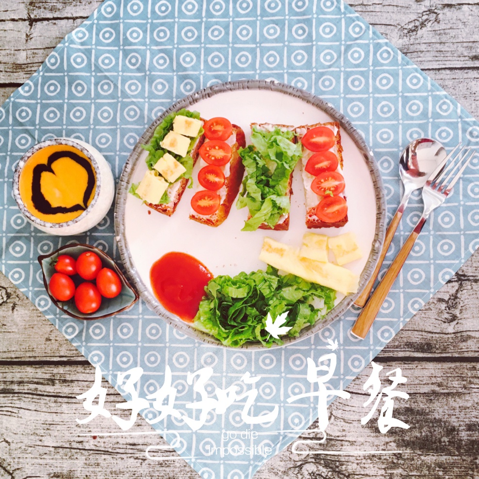 今天开放三明治,土司+沙拉酱+水果蔬菜+厚蛋烧,还有南瓜汤~~