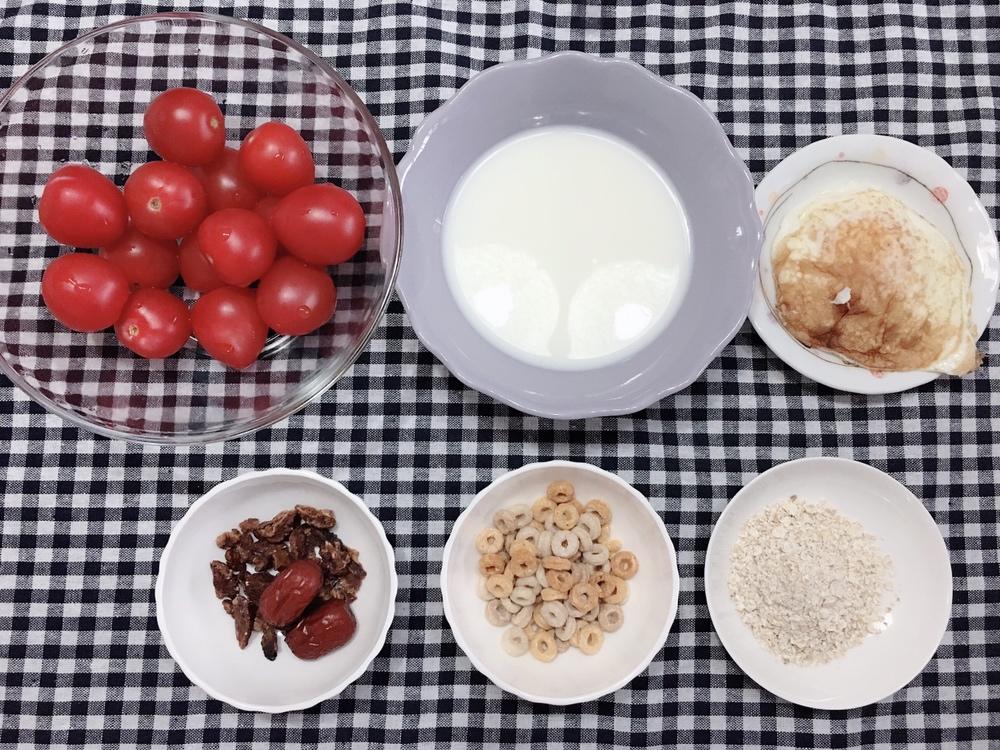 燕麦 谷物 牛奶 鸡蛋 小番茄 红枣 核桃仁