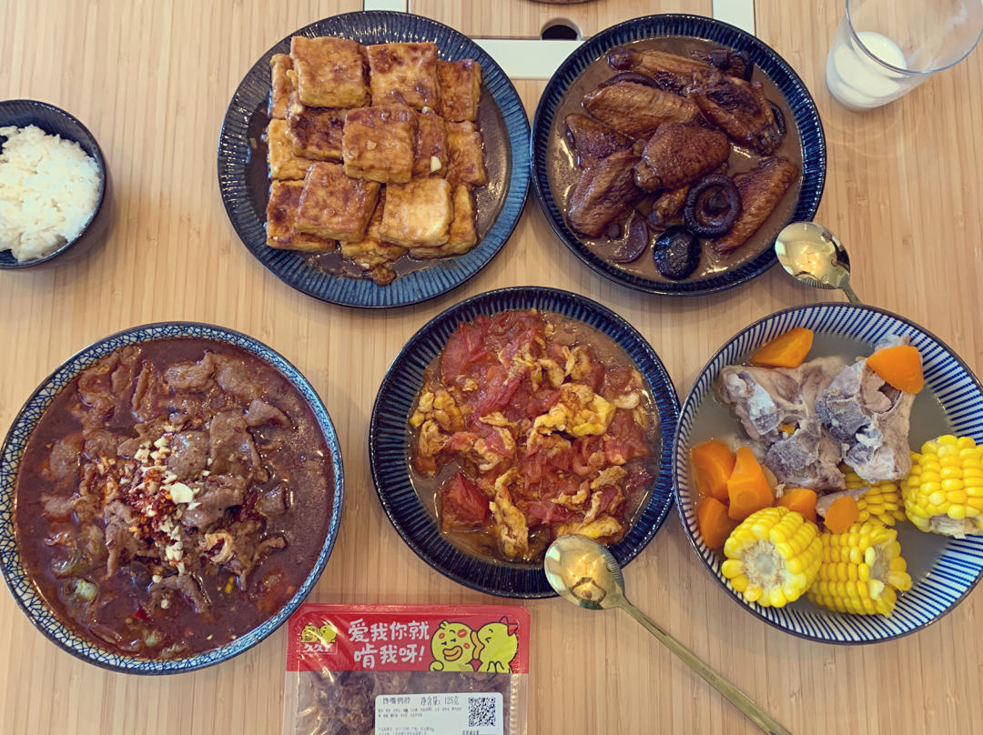 锅塌豆腐,水煮牛肉,西红柿炒鸡蛋,香菇炖鸡翅,鸭脖子,脊骨玉米胡萝卜汤~#午餐•2020年10月5日#