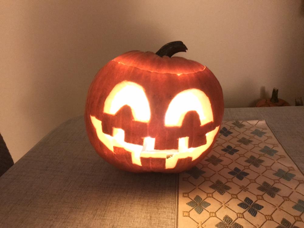 中午做了南瓜饼,用掏空的壳刻个南瓜灯。