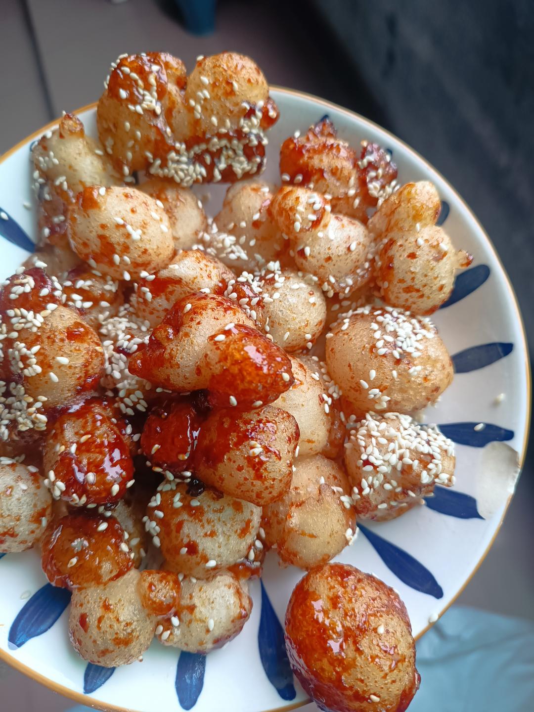 根据食谱做的,用了一袋400克,感觉太多了,炸了两大盘,自己边炸边吃,吃了3-4块,结果后面还有不少面,搓了一点小圆子冷...