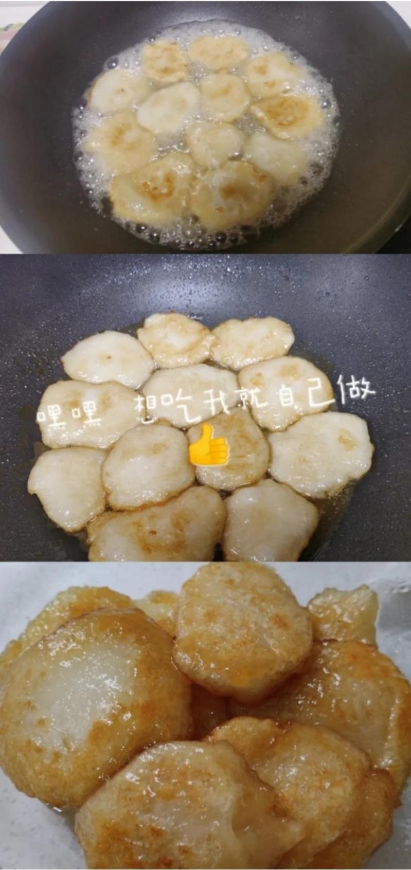 成球压扁成小圆饼。红糖白糖用温水化开成半碗。锅里倒油,小火炸两面至金...