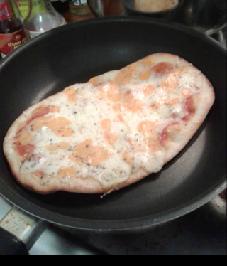 半成品披萨放进热锅小火加盖,过一会就擦擦盖子上的水,十分钟就好啦~