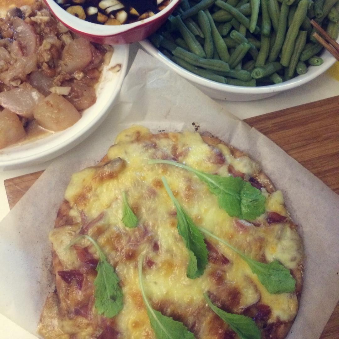 瑶柱煲萝卜、凉拌扁豆、打卤馕(烟熏培根、西班牙火腿、蘑菇、萝卜苗)