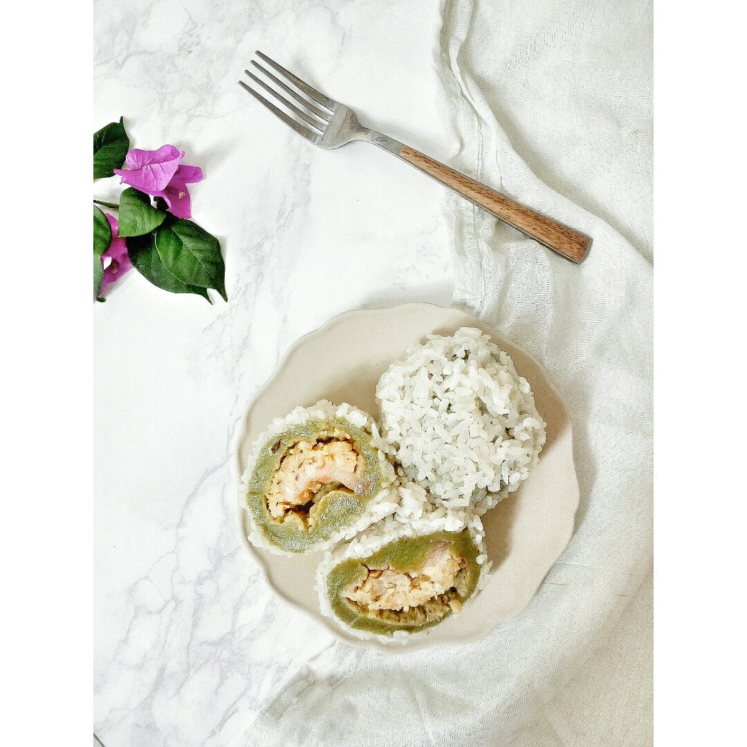 糯米团子!从外面依次是 糯米饭,茼蒿汁糯米团,咸绿豆馅,五花肉,热腾腾...