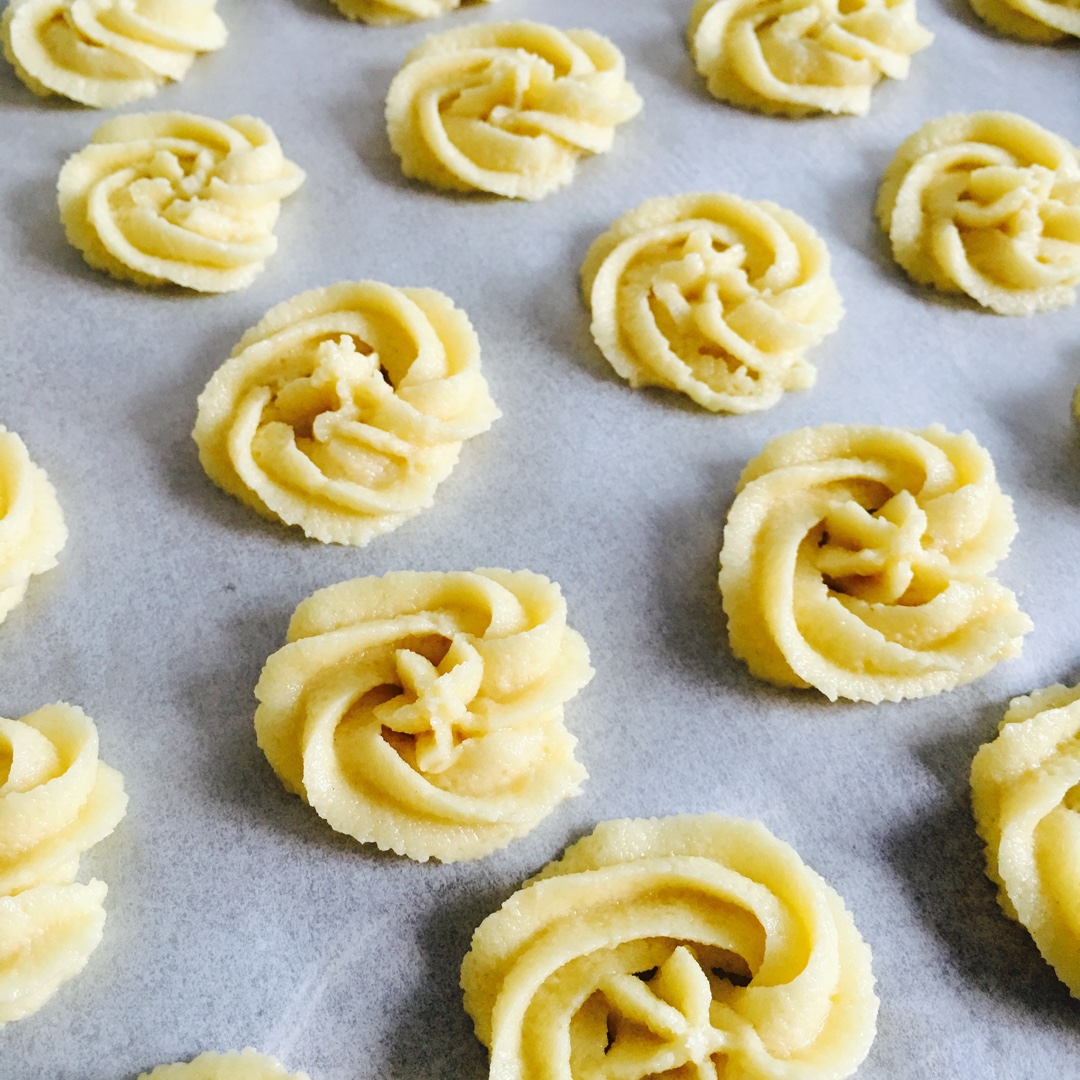 以为黄油打发过度了 还好 成型好 四样原料很简单 烤箱太小受热不均匀 方子减半加了奶粉 成品还是很酥的 就是有几个过度了...