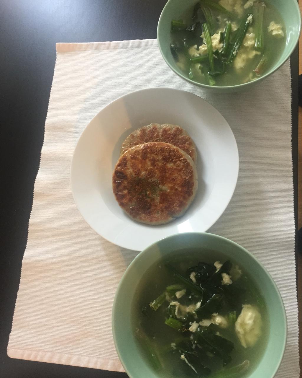 菠菜汤,韭菜饼~