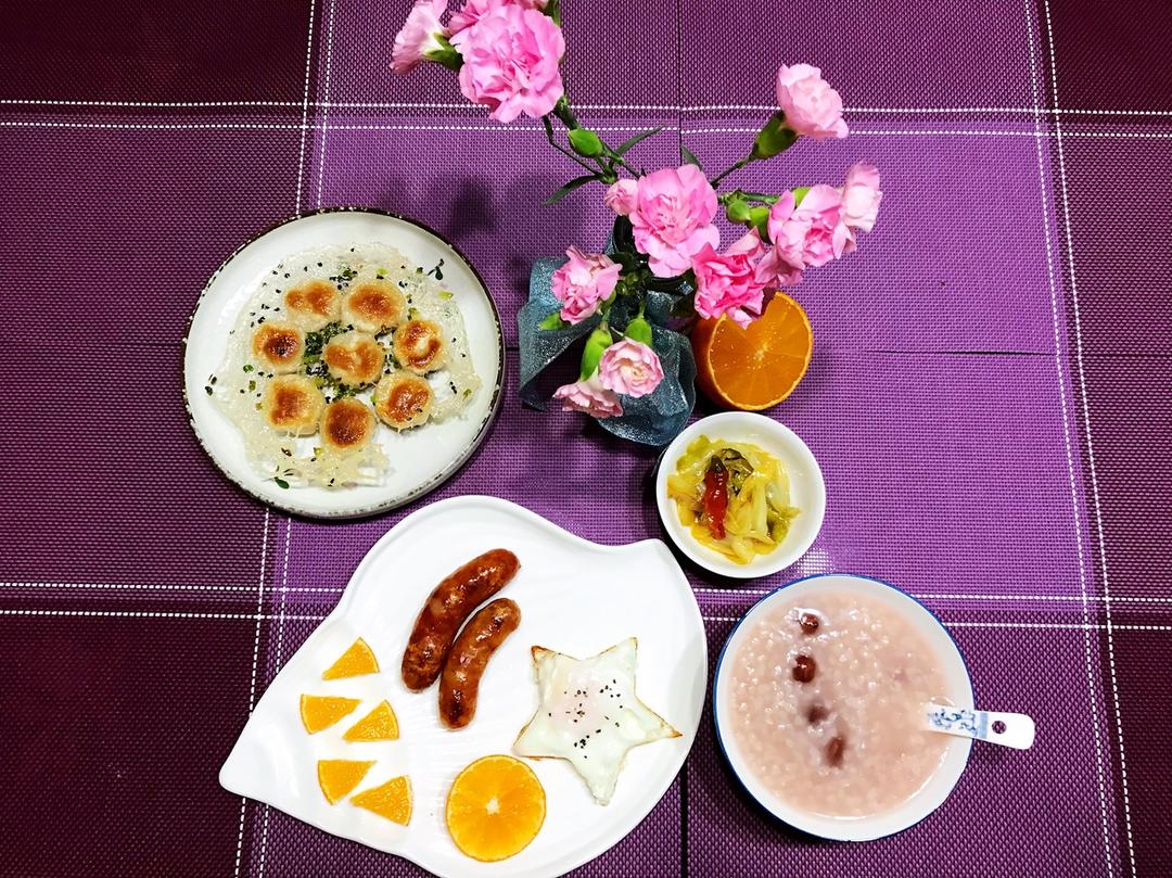 早早起床做了冰花水煎指拇包、花生粥、星星🌟蛋、脆皮小香肠,配上小菜、橙子,饱餐一顿出门学拳。#早餐•2018年11月24...