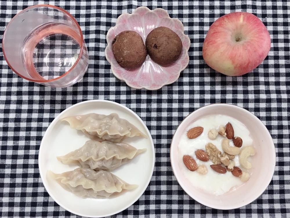 猪肉白菜蒸饺 可可麻薯 坚果 自制酸奶 苹果