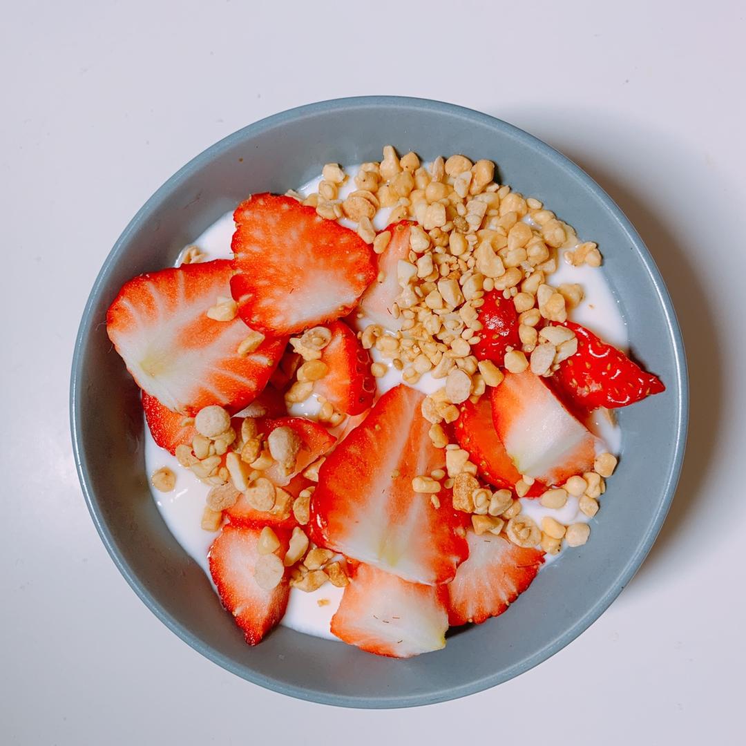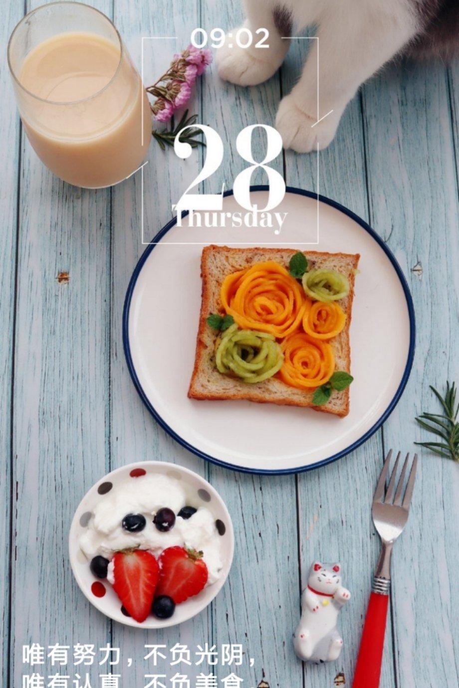 早,养乐多+玫瑰吐司+酸奶草莓+胖胖😘