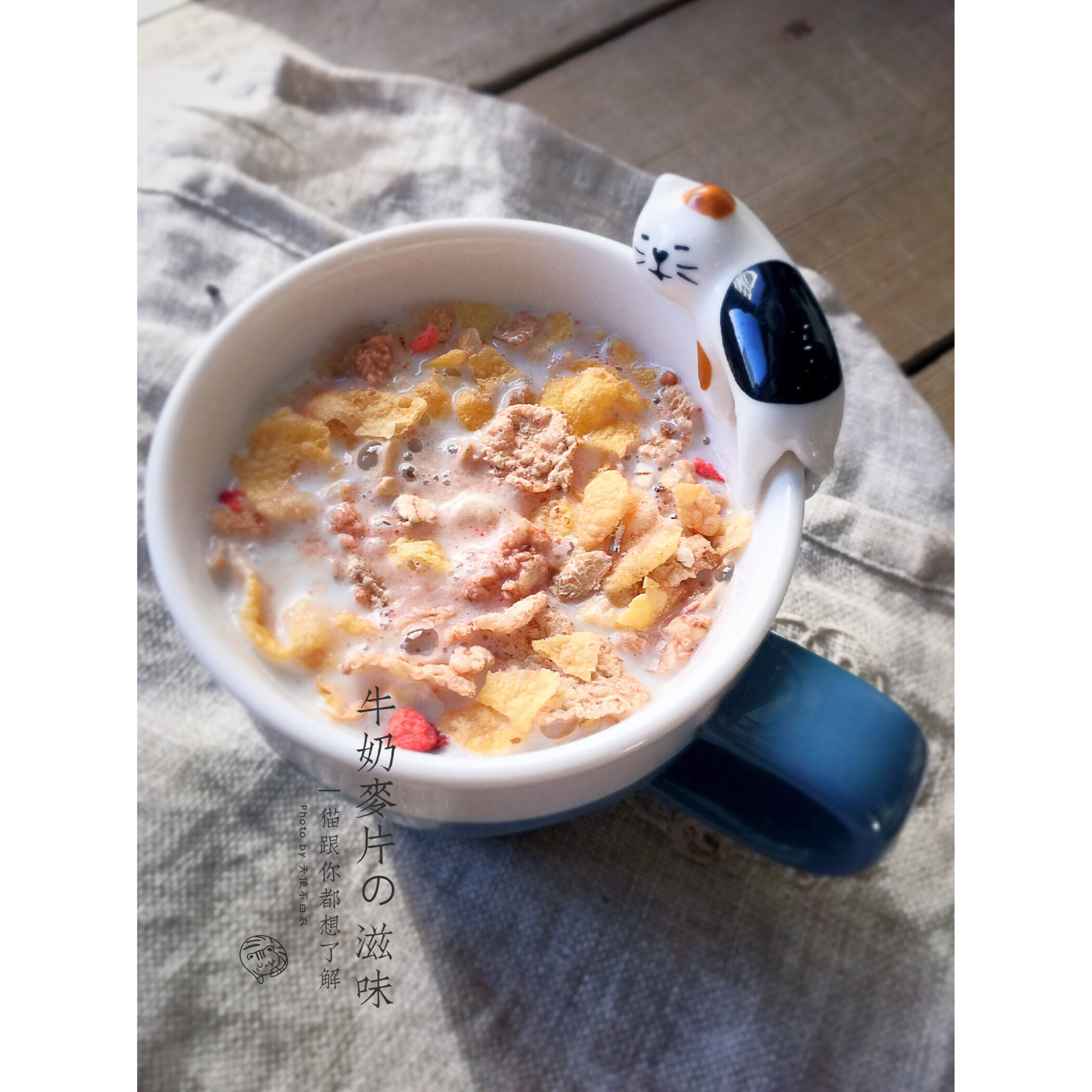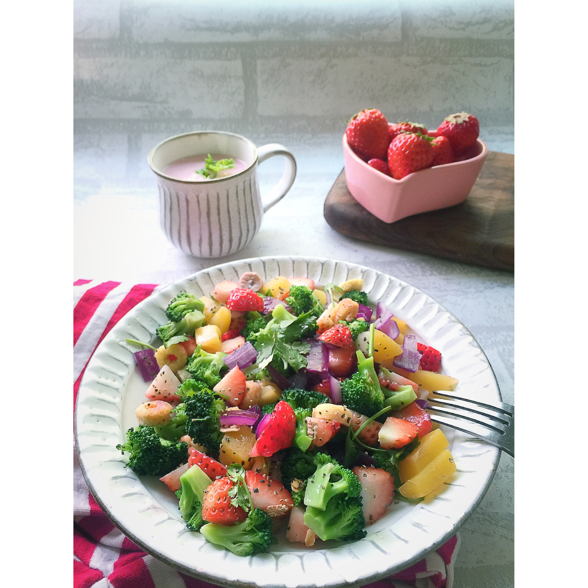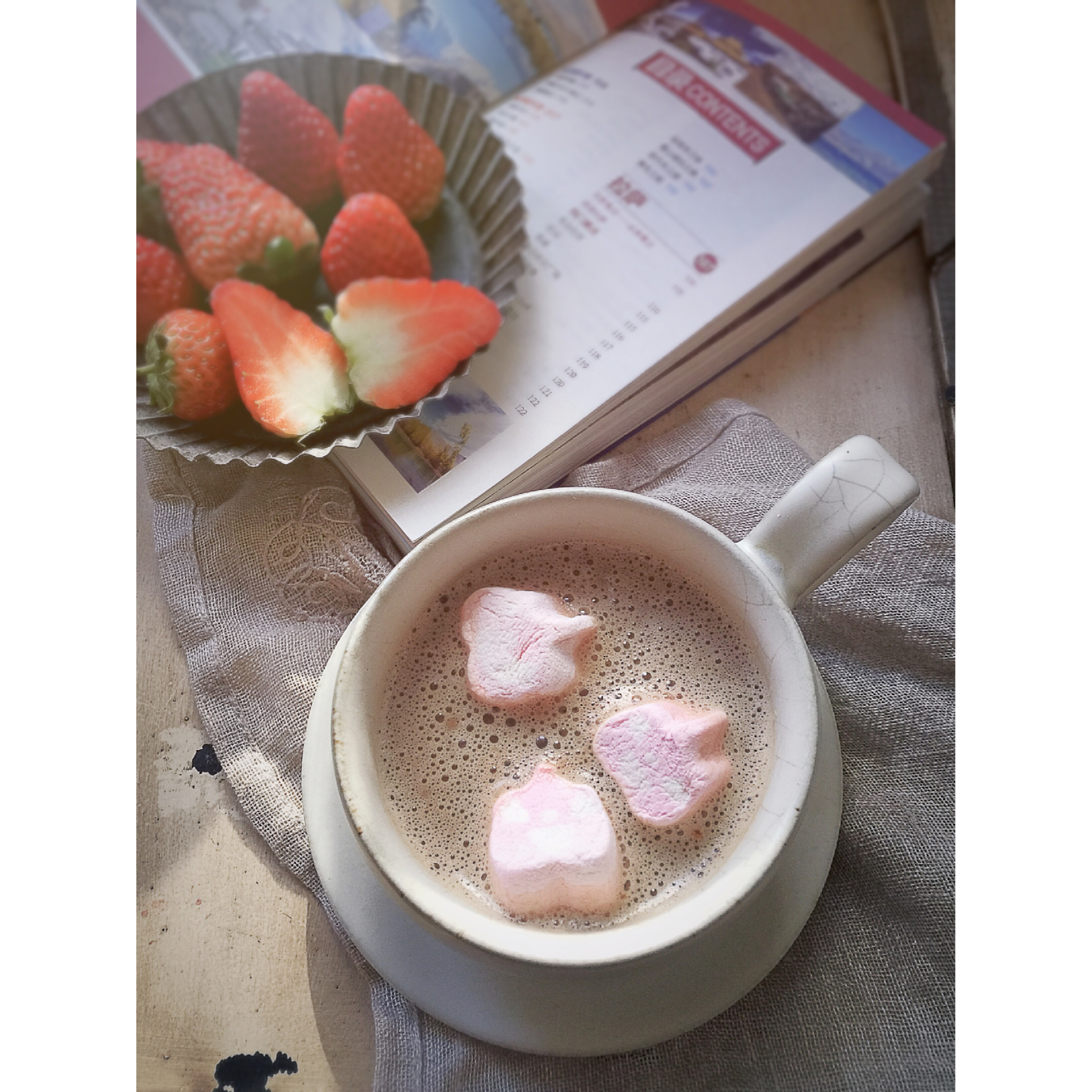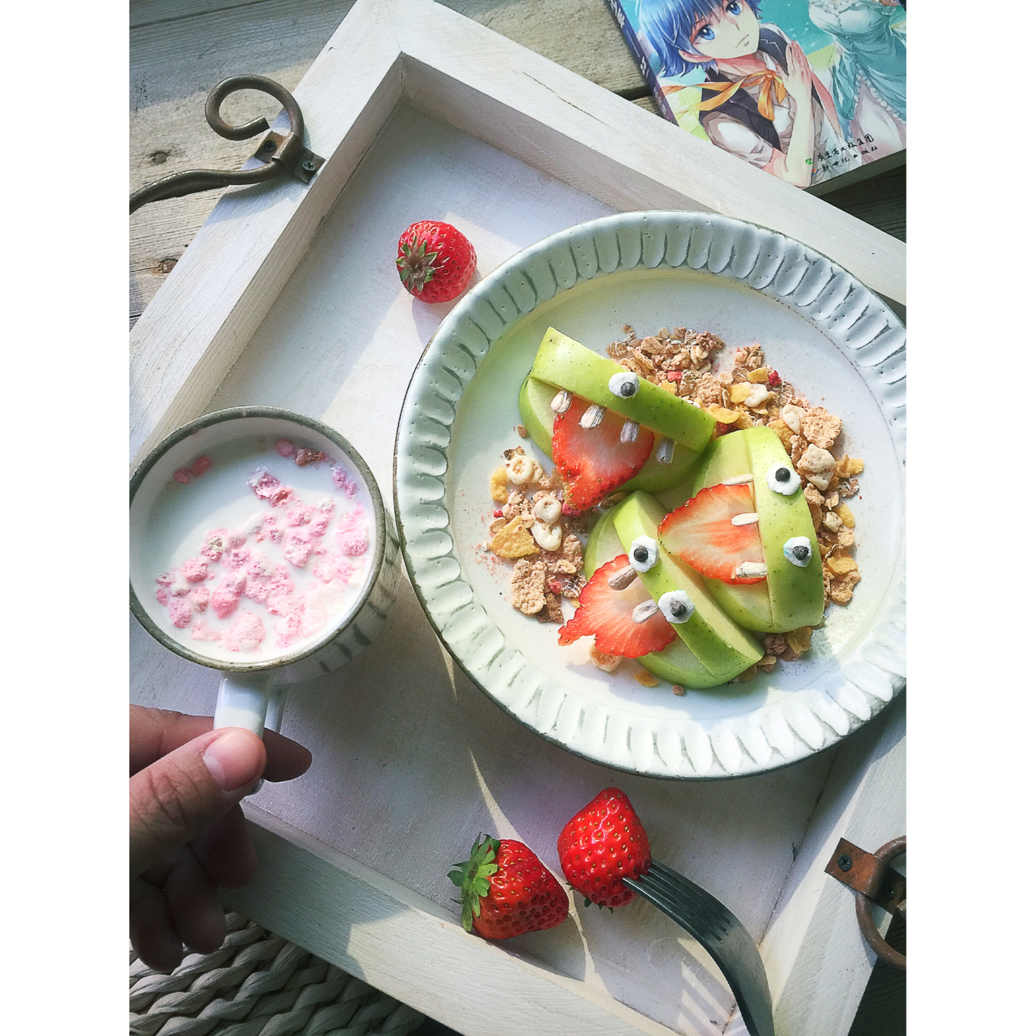 早餐:草莓棉花糖牛奶、草莓蔬果麦片、水果也是草莓