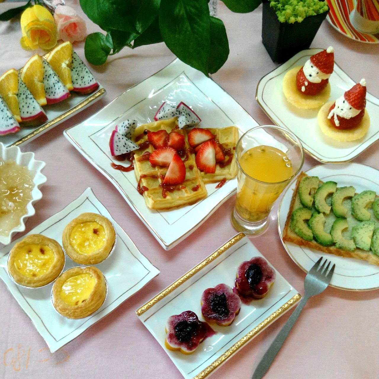 早安!做了糯米粉华夫饼,牛油果三明治,蓝莓南瓜山药,现烤了蛋挞,小雪人乳酪蛋糕,银耳桃胶...