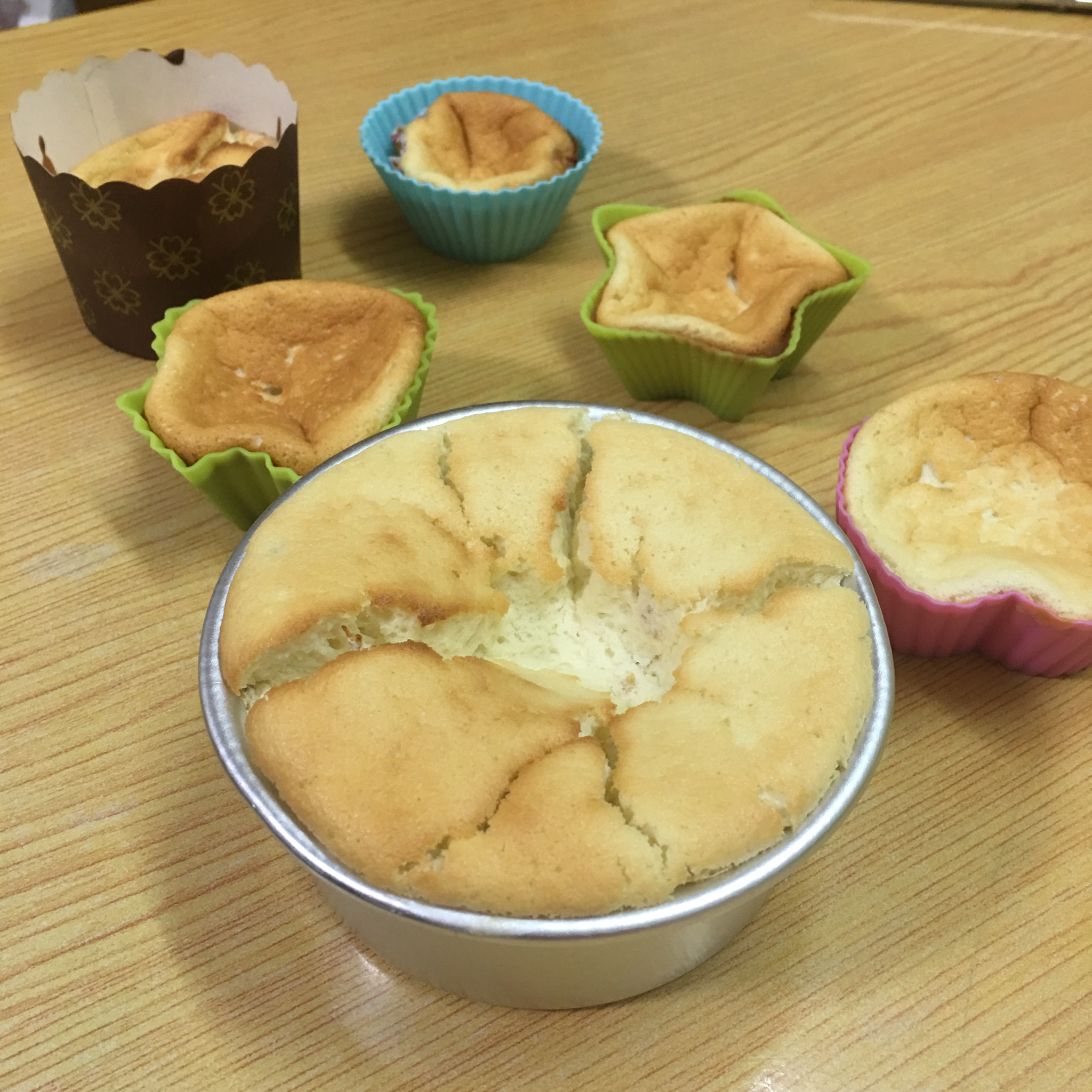 跟着配方,做了大大小小的6个蛋糕,最大的是4寸模的,很香的酸奶味,刚做好的时候涨得很鼓,一会就下限了,不过不太影响口感,...