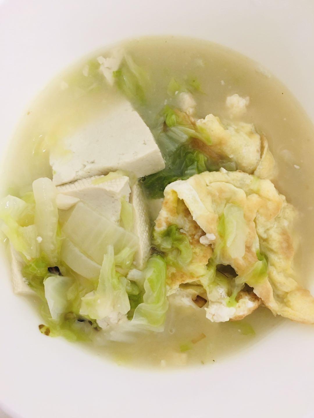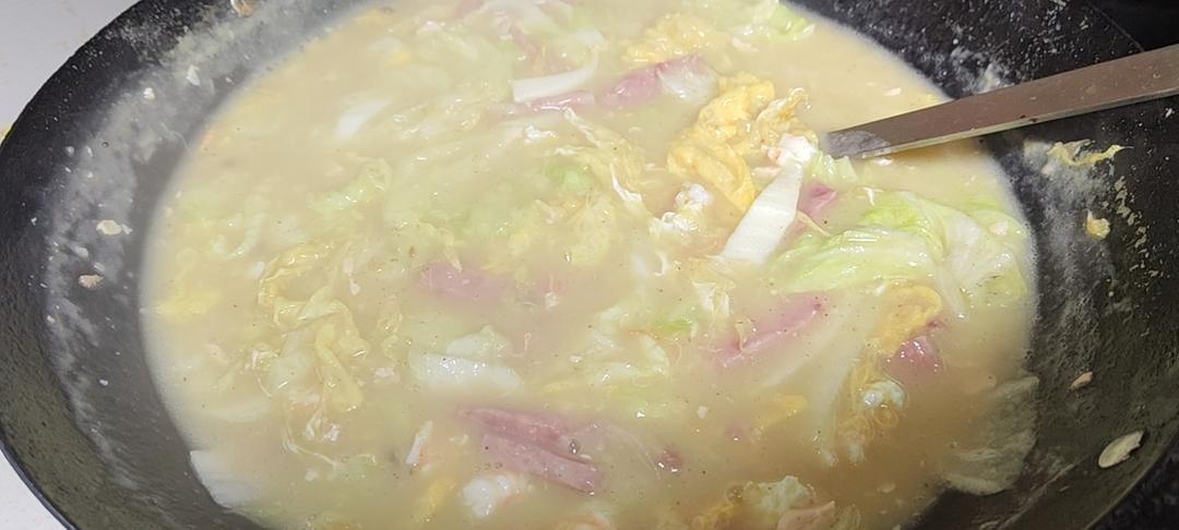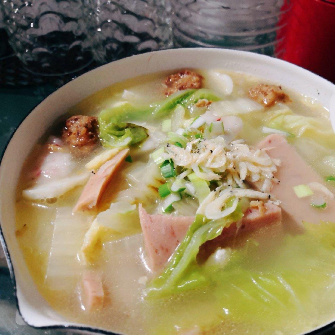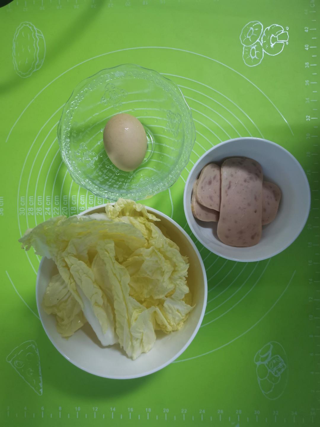 用料:白菜叶、木耳、粉丝、香肠、鸡蛋、盐、白胡椒粉(没有的用花椒粉)味精鸡精...