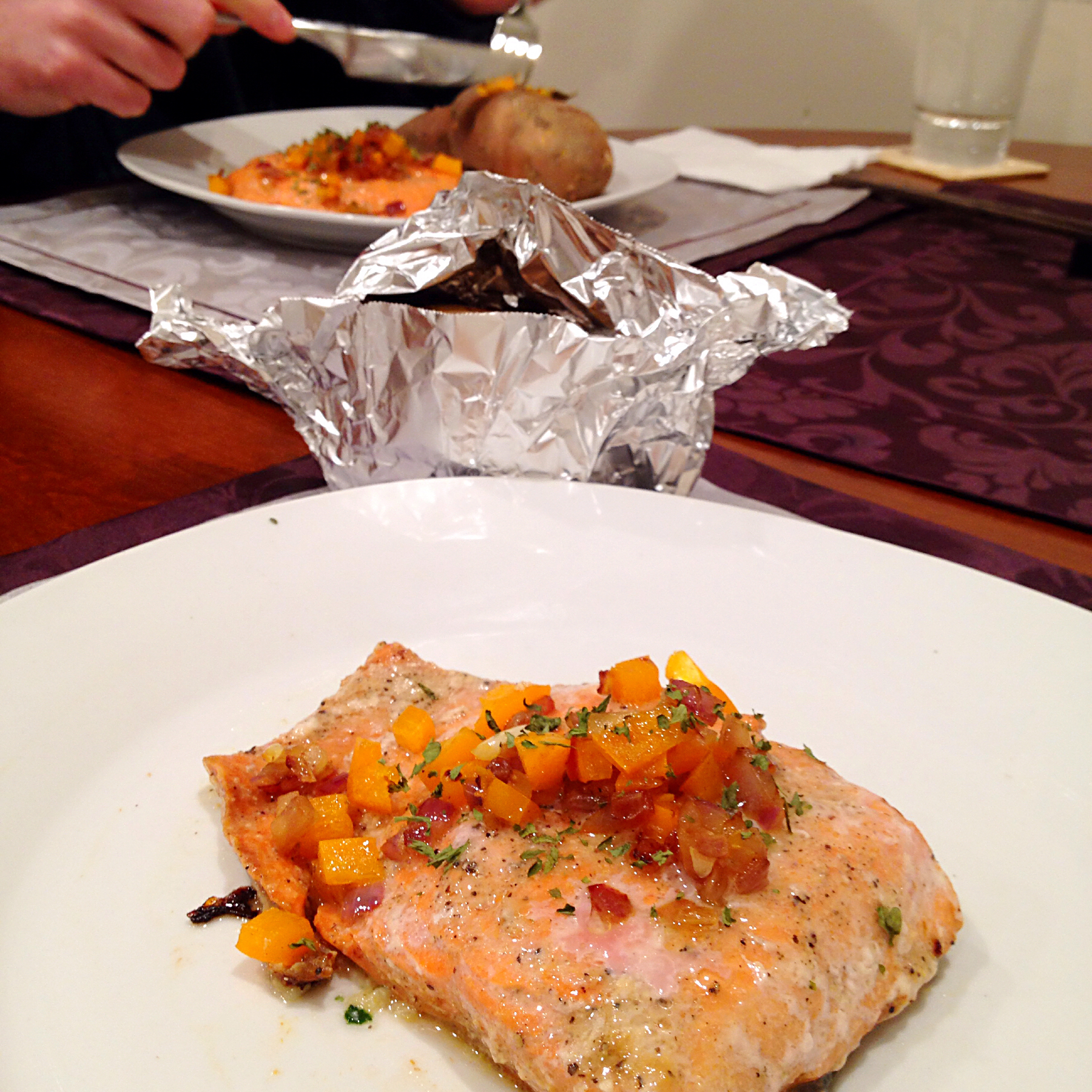 今天的晚餐是做一道吃一道的,蒜香煎带子和菠菜;香煎味噌三文鱼和烤红薯;烤雪蟹。其中,红薯和雪蟹都是阿当先生做的。最后附张...