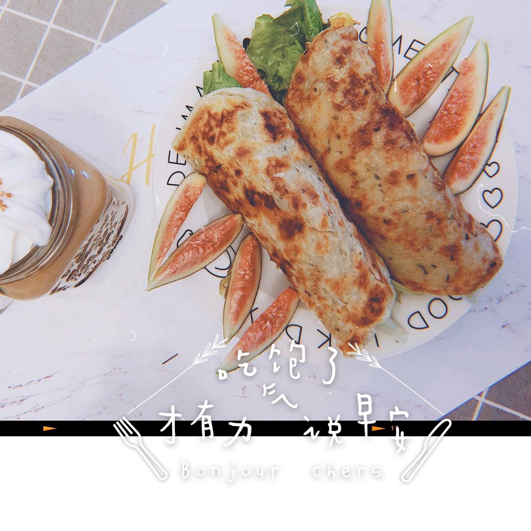自制饼底,➕🥚,🥒🥬,肉松,沙拉酱!周末吃的更满足