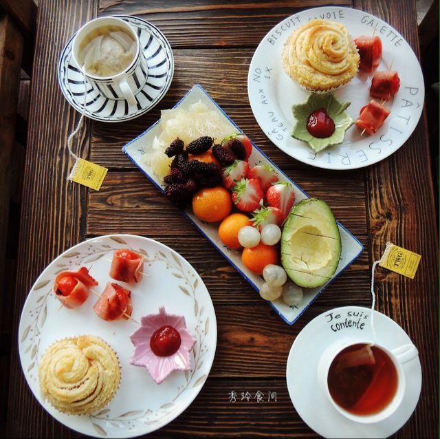 千层椰蓉小面包,圣女果火腿卷,水果,TWG tea!