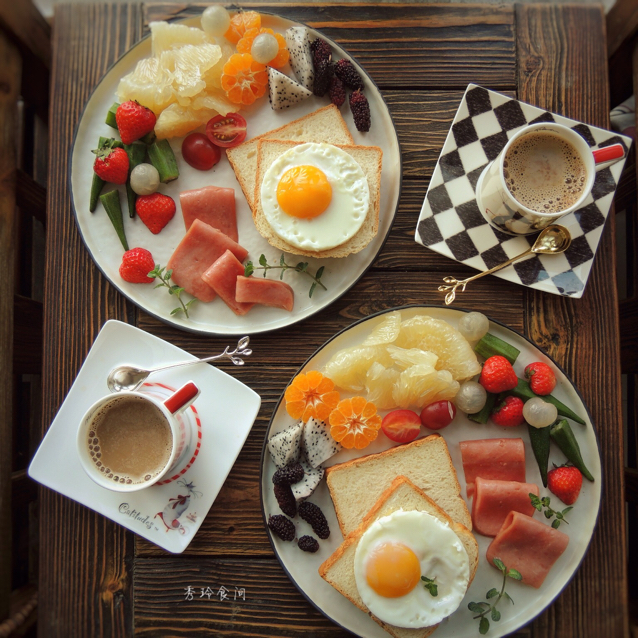 香蕉吐司盒,太阳煎蛋,干肠,棒肉,水果,旧街场的白咖啡,还有鲜榨柠檬、橙汁和黑芝麻糊木有出镜...