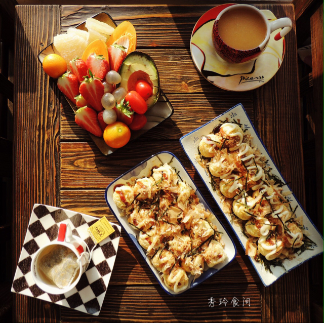 泽宝贝最爱的章鱼小丸子,水果,鲜榨柠檬、梨、木瓜汁,TWG tea!