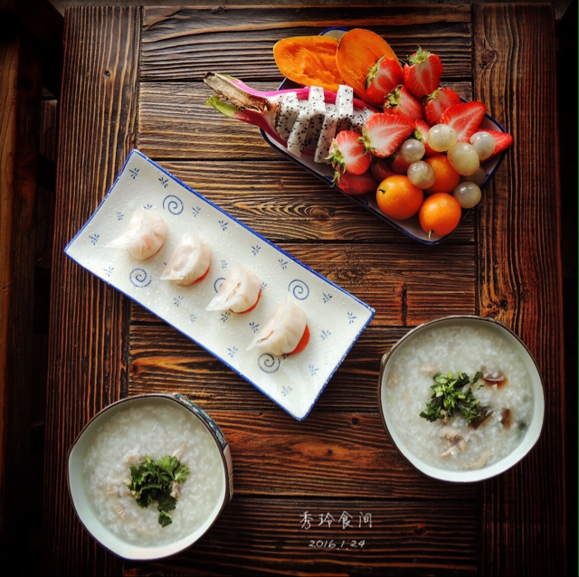 弯梳虾饺,皮蛋瘦肉粥,水果!