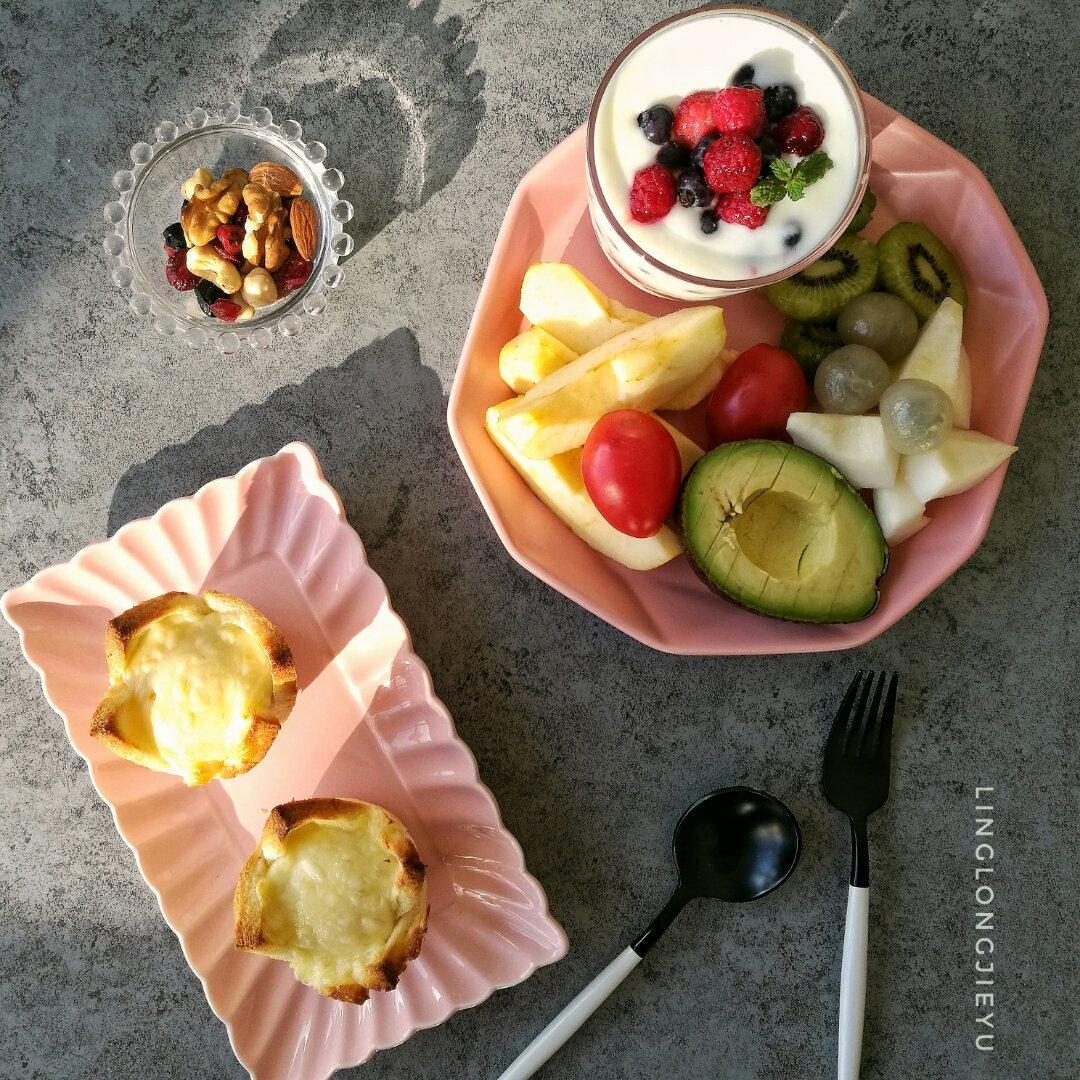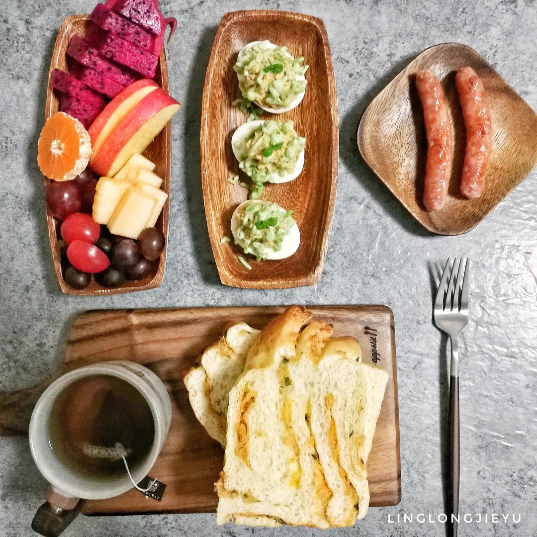 香葱肉松手撕包,牛油果金枪鱼鸡蛋盏,齿物香肠,水果,锡兰红茶!
