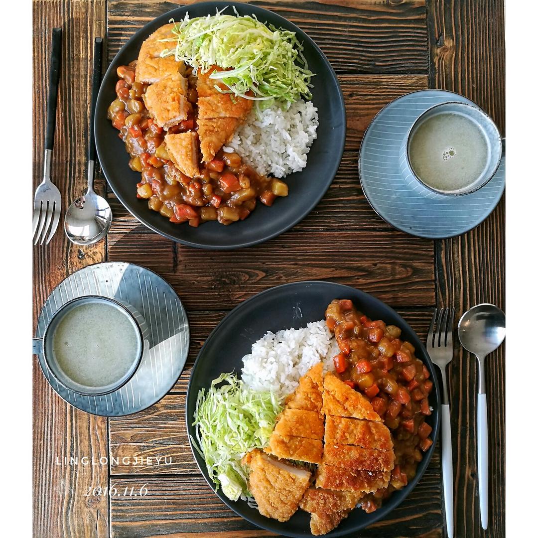 两个人的早餐,咖喱鸡排饭,水果,鲜榨苹果、梨汁!