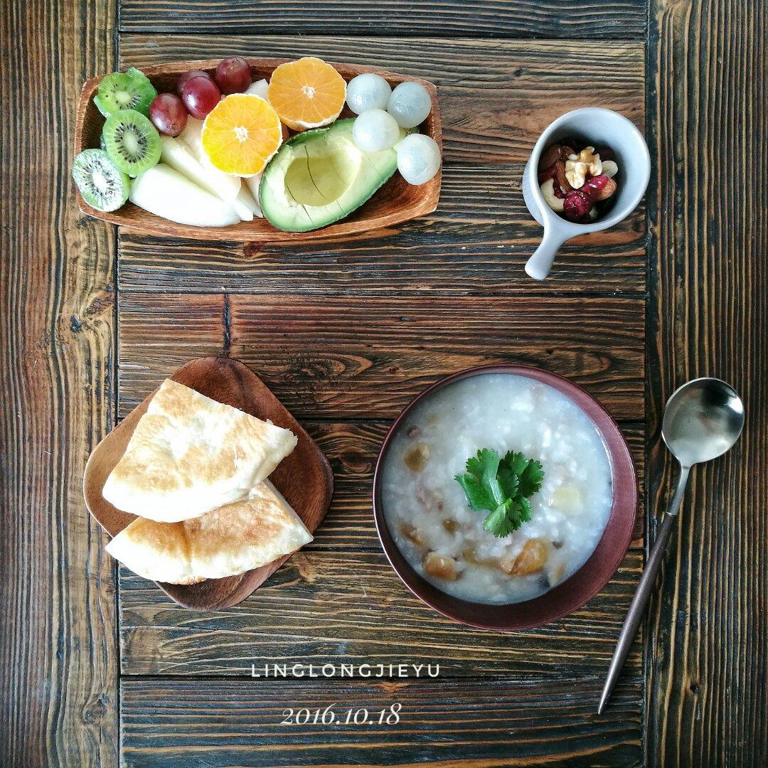 皮蛋瘦肉粥,发面饼,水果,每日坚果!