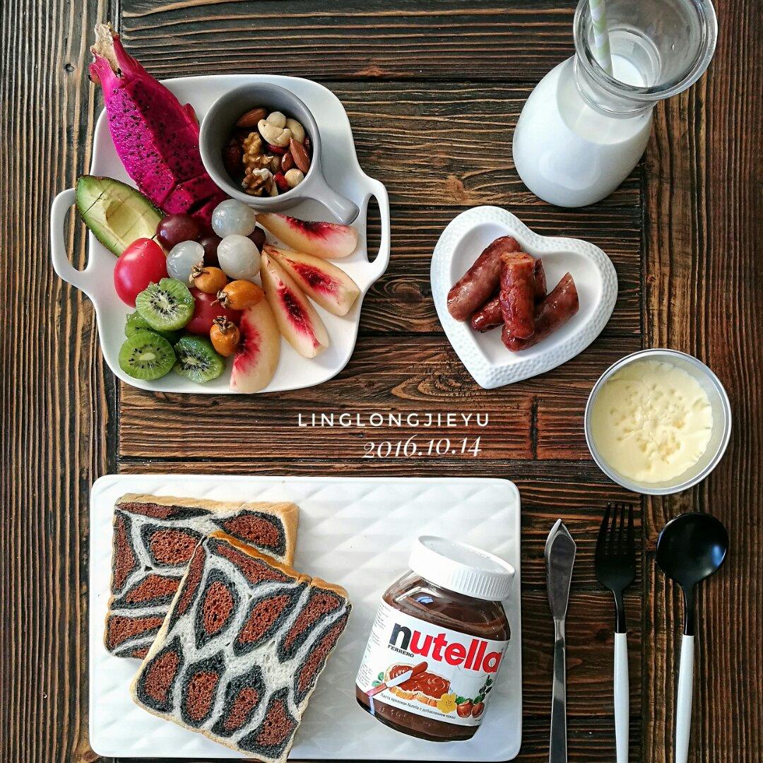 斑纹吐司+巧克力酱,法式布丁,齿物香肠,每日坚果,水果,牛奶!
