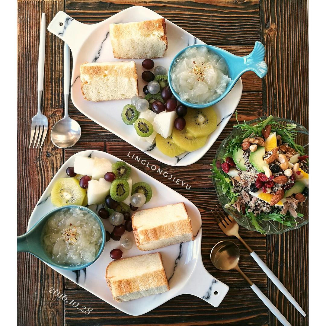 青井老师の原味戚风,银耳雪梨羹,水果,藜麦金枪鱼牛油果沙拉,红豆薏米水...
