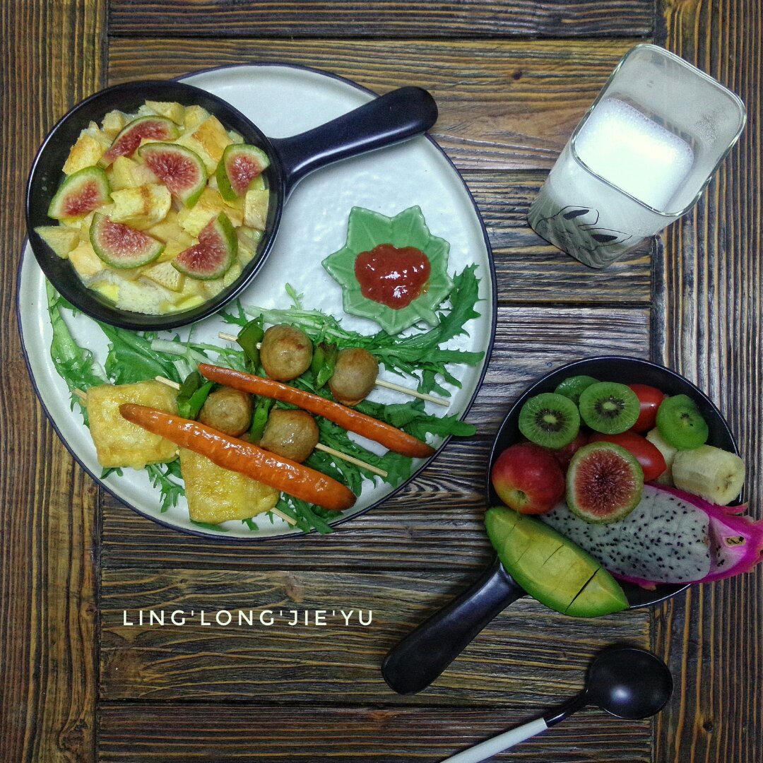 无花果吐司桃子布丁,烤牛肉丸、胡萝卜、豆腐,水果,牛奶!