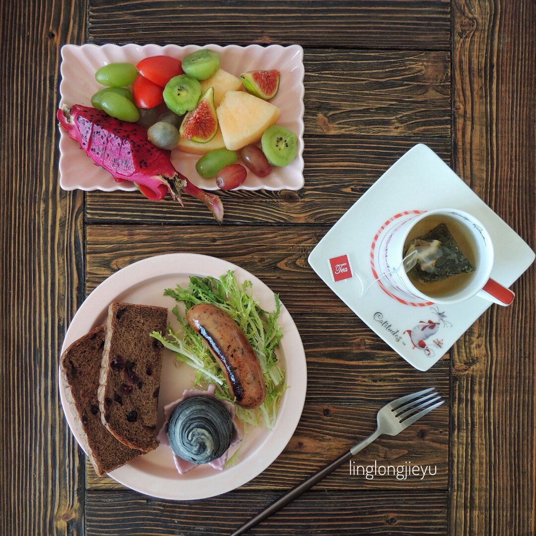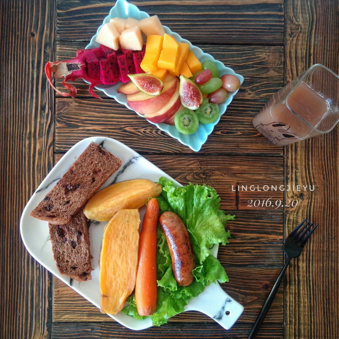 蔓越莓巧克力吐司,蒸红薯、胡萝卜,台湾香肠,水果,鲜榨葡萄汁![愉快]