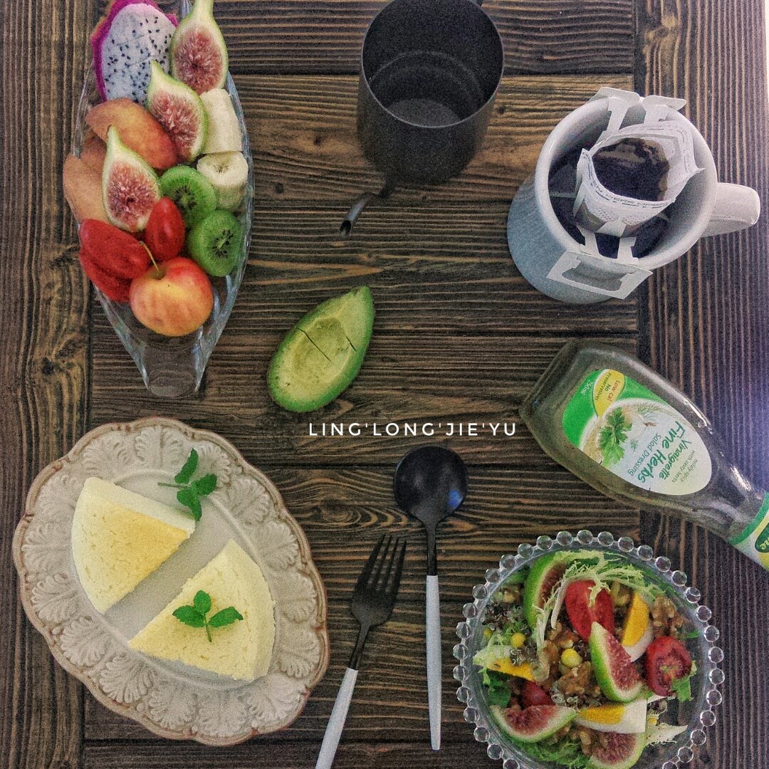 轻乳酪蛋糕,三色藜麦沙拉,水果,黑咖!