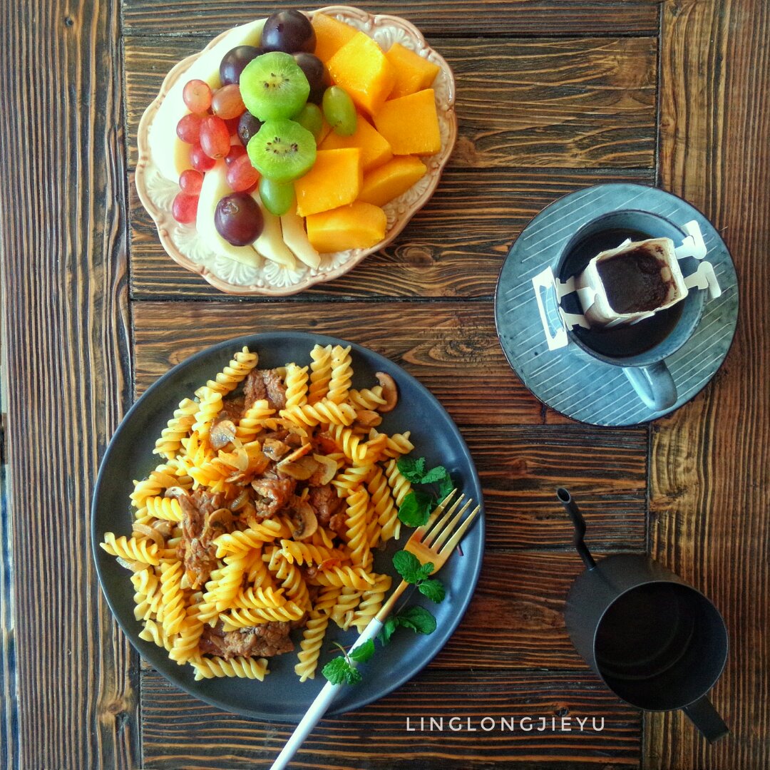 牛肉口蘑意面,水果,黑咖!