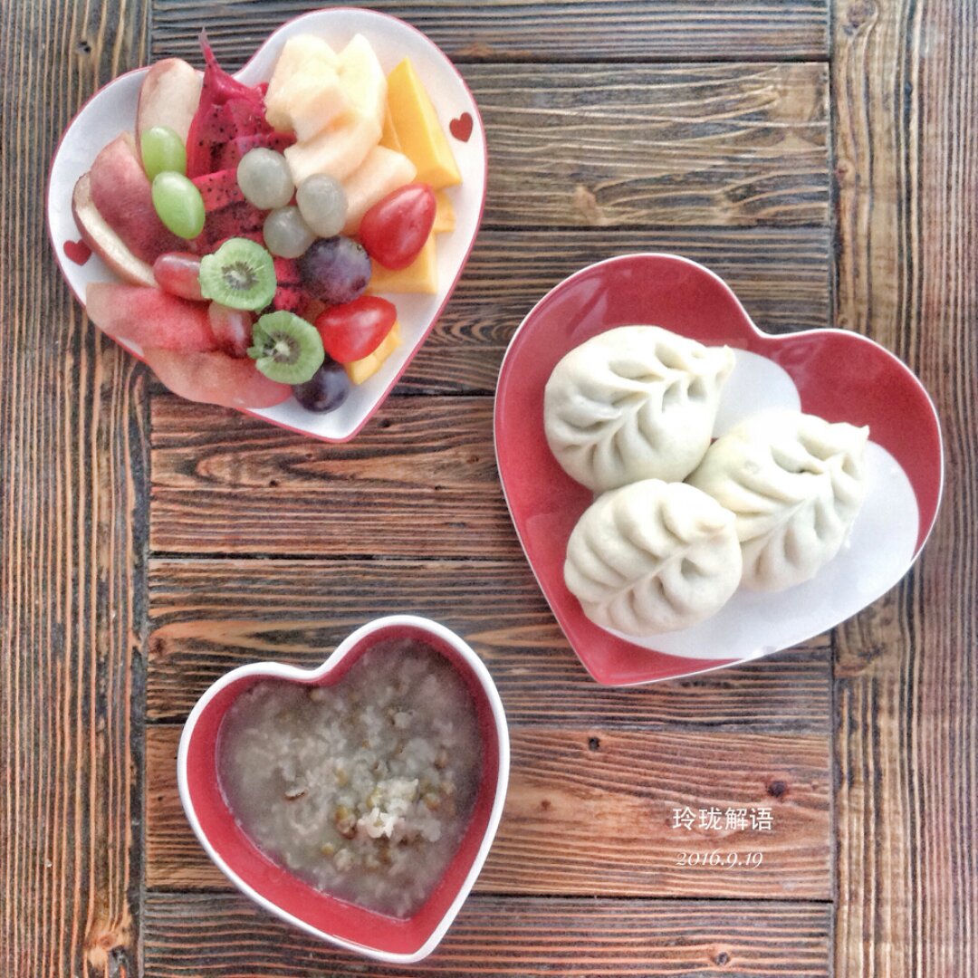 柳蒿芽猪肉馅包子,大米绿豆粥,水果!
