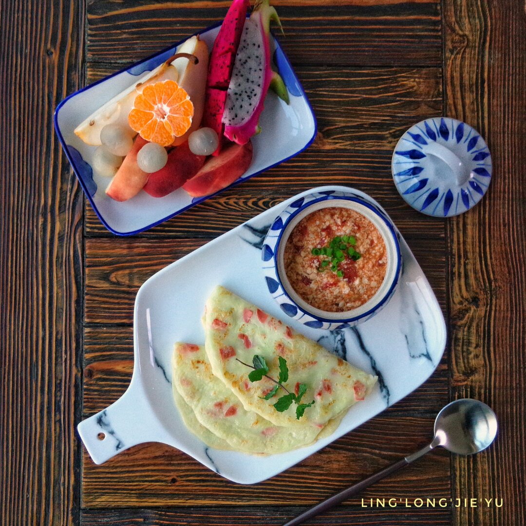 西葫芦火腿肠鸡蛋饼,西红柿豆腐羹,水果!