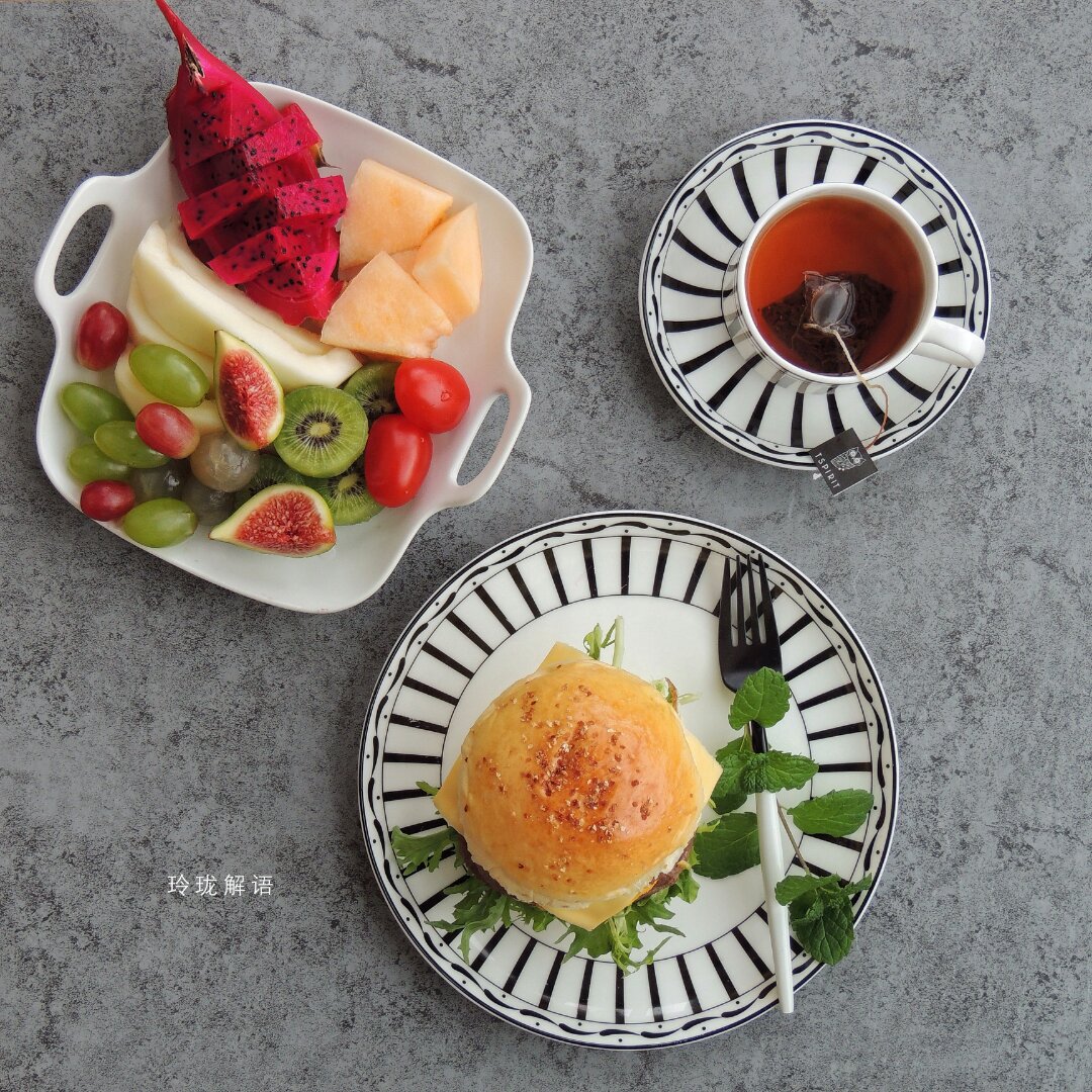 牛肉汉堡,水果,果茶!