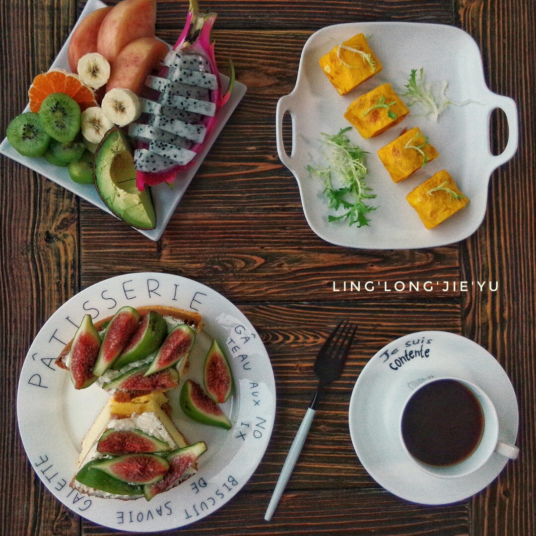 杨先生的早餐,酸奶戚风,火腿厚蛋烧,水果,黑咖!