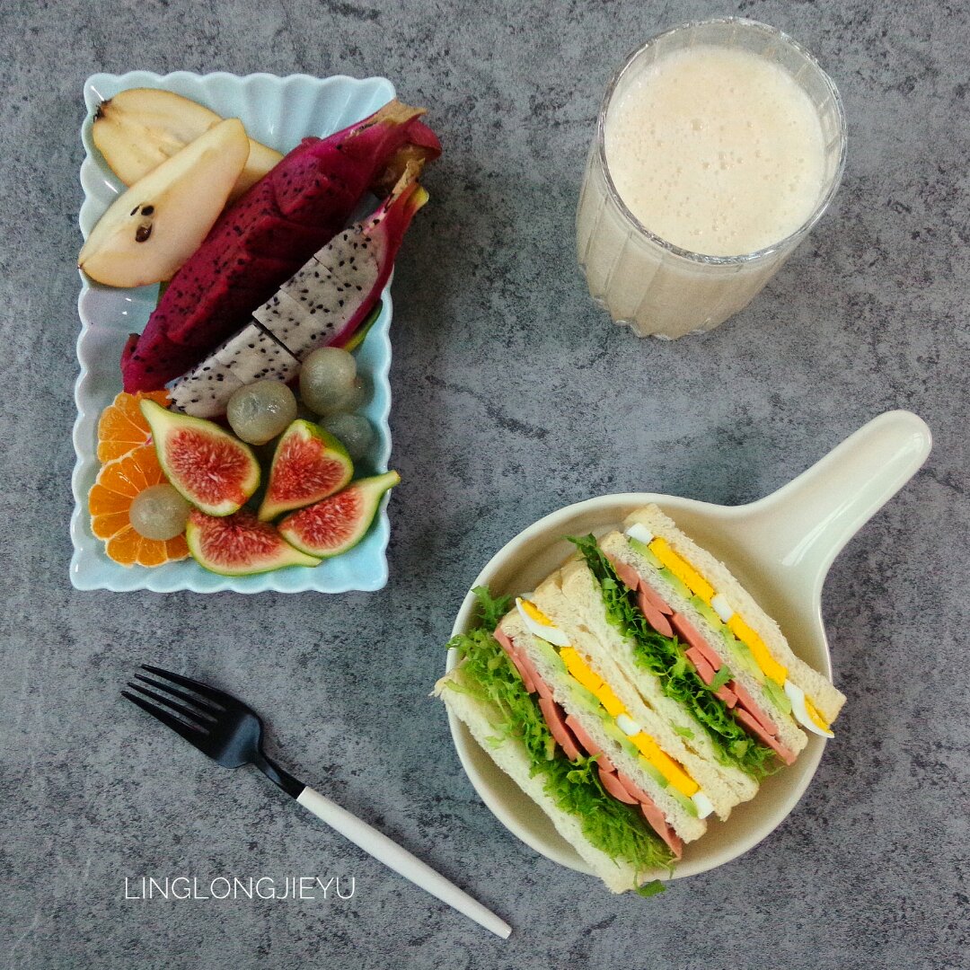 牛油果鸡蛋三明治,水果,鲜榨桃汁!