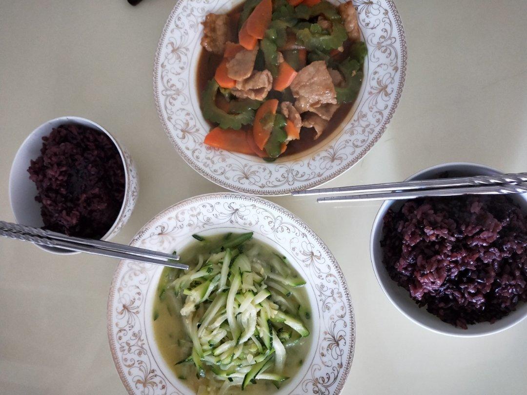 剩下的半个南瓜,剩下的半个苦瓜和剩下的半个胡萝卜,这就是俺们娘俩的午饭😂