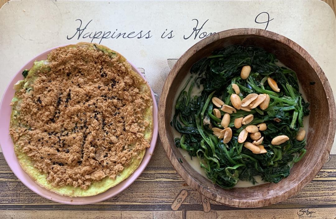 今天答應幫我妹妹備早餐,所以整個早上弄到快午餐才忙完..豬腳是冷凍櫃裡的,然後怕被投訴,煎了個蛋炒了青菜!腦公還算體貼,...