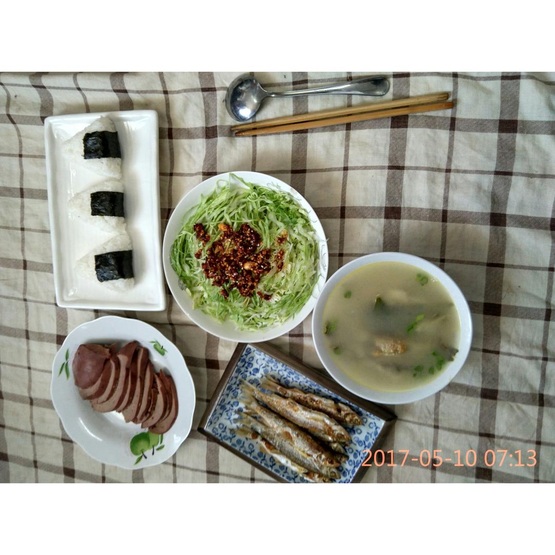 海苔饭团+鲫鱼汤+咸水猪肝+凉拌包菜丝+香煎小白鱼