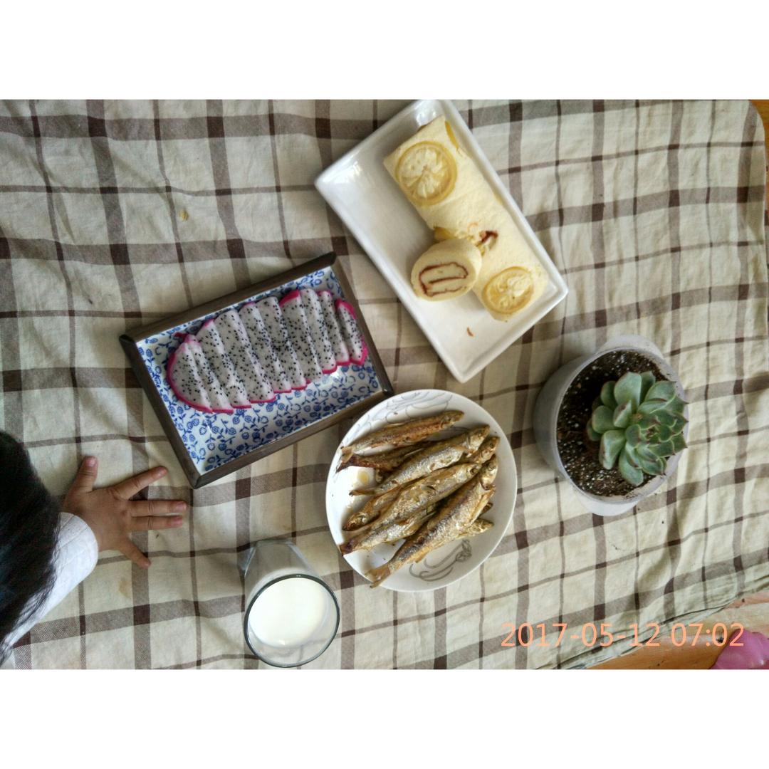 柠檬蛋糕卷+牛奶+火龙果+香煎小白鱼