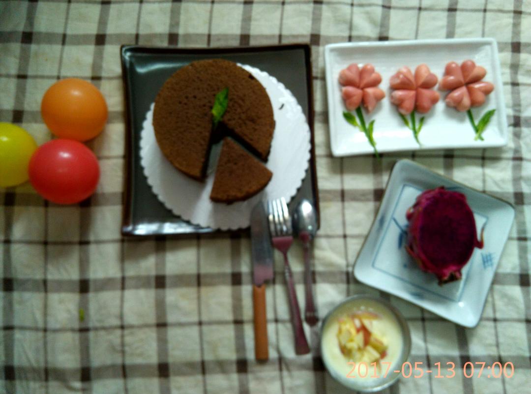 巧克力戚风蛋糕+酸奶苹果+四叶草香肠+火龙果