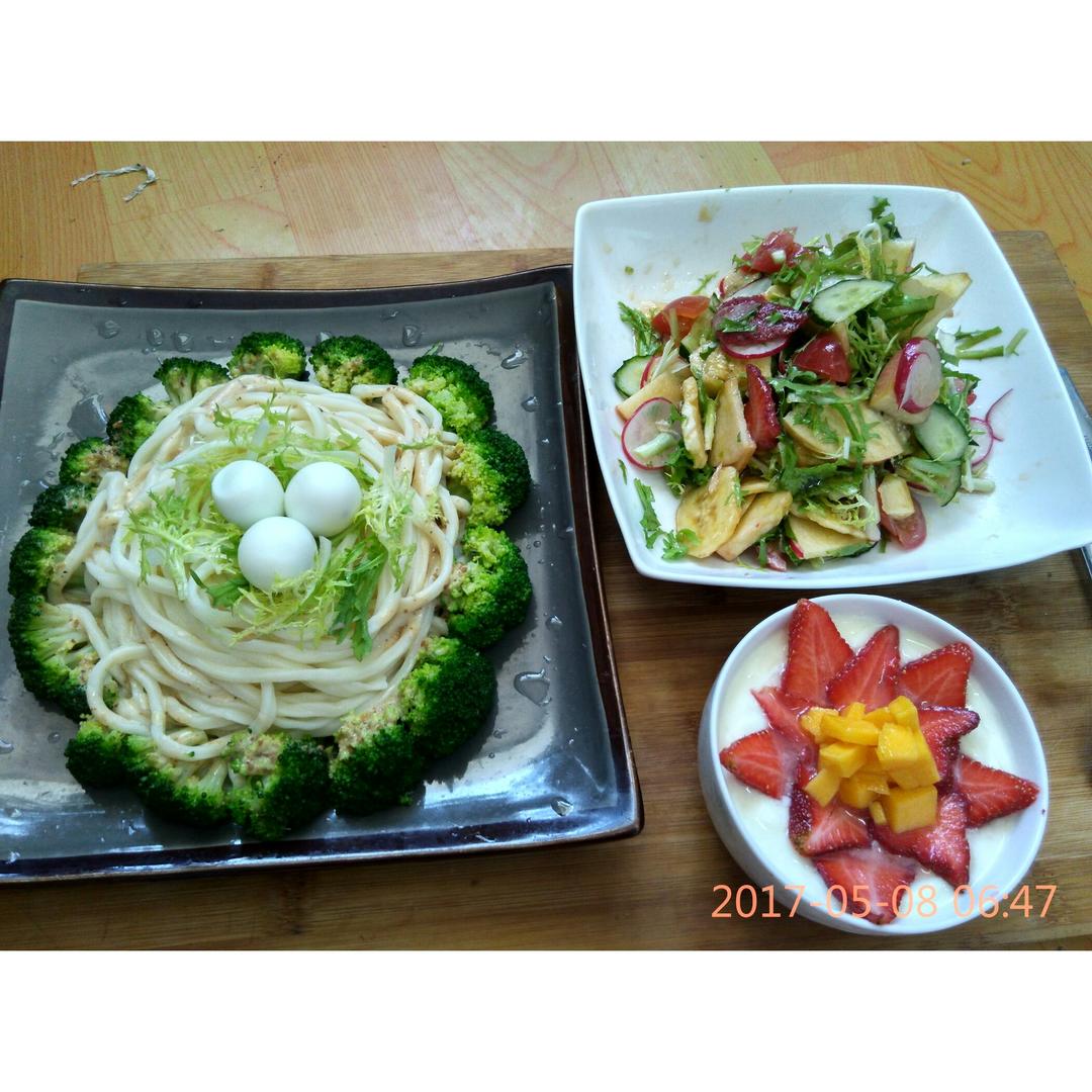 凉拌面+芒果草莓酸奶+蔬菜水果沙拉