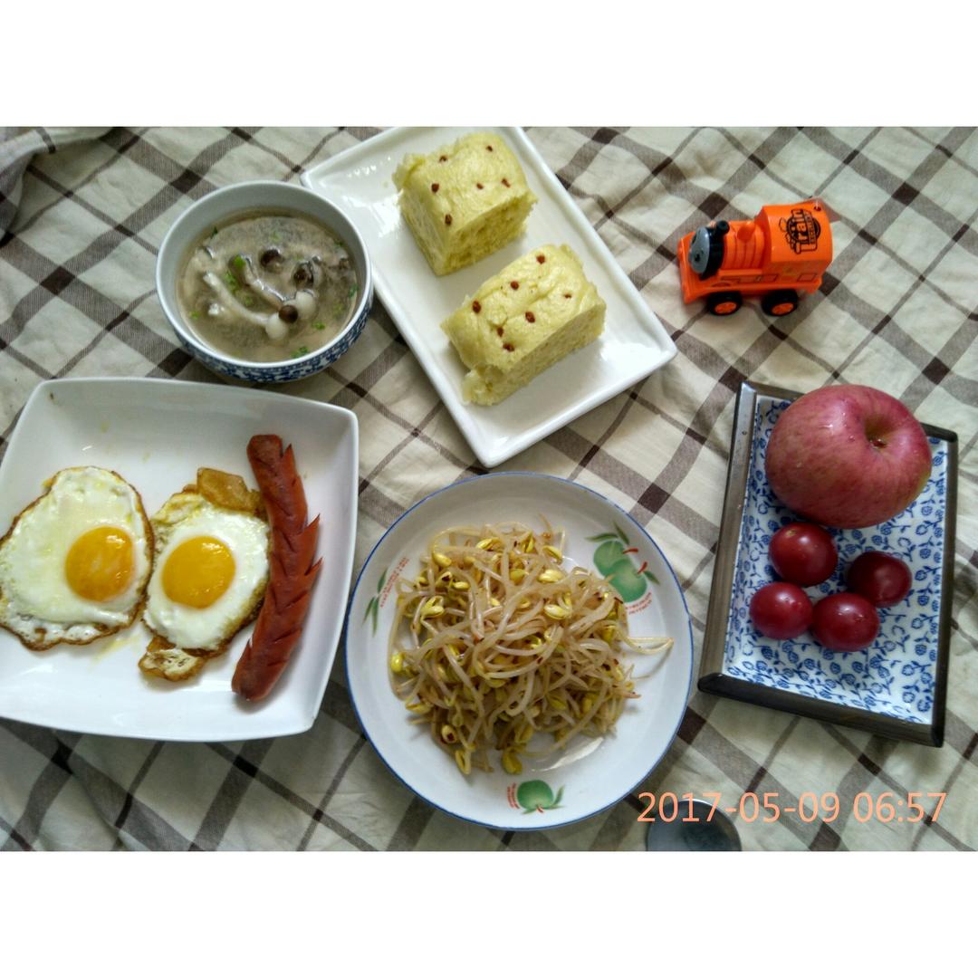 发糕+蘑菇汤+香肠鸡蛋+凉拌豆芽菜+苹果圣女果