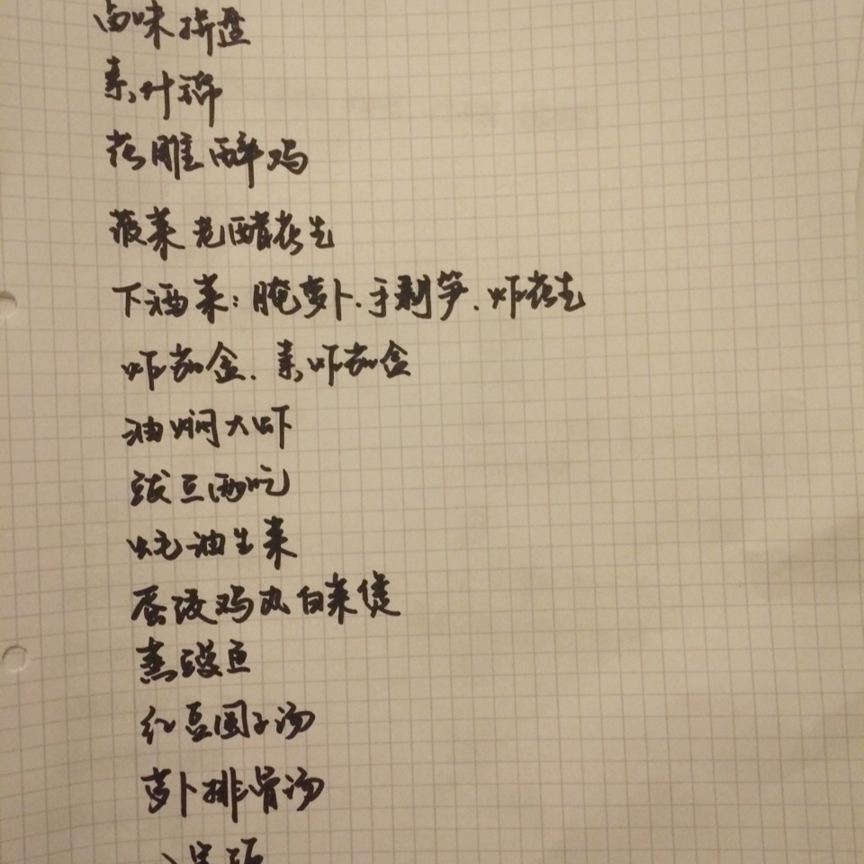 第一年和爸爸两个人做两桌年夜饭!这个菜单是我的,爸爸的是凉拌皮蛋 素什锦 四喜烤麸 白菜拌蜇皮 红烧肉 烧平鱼 油焖大虾...