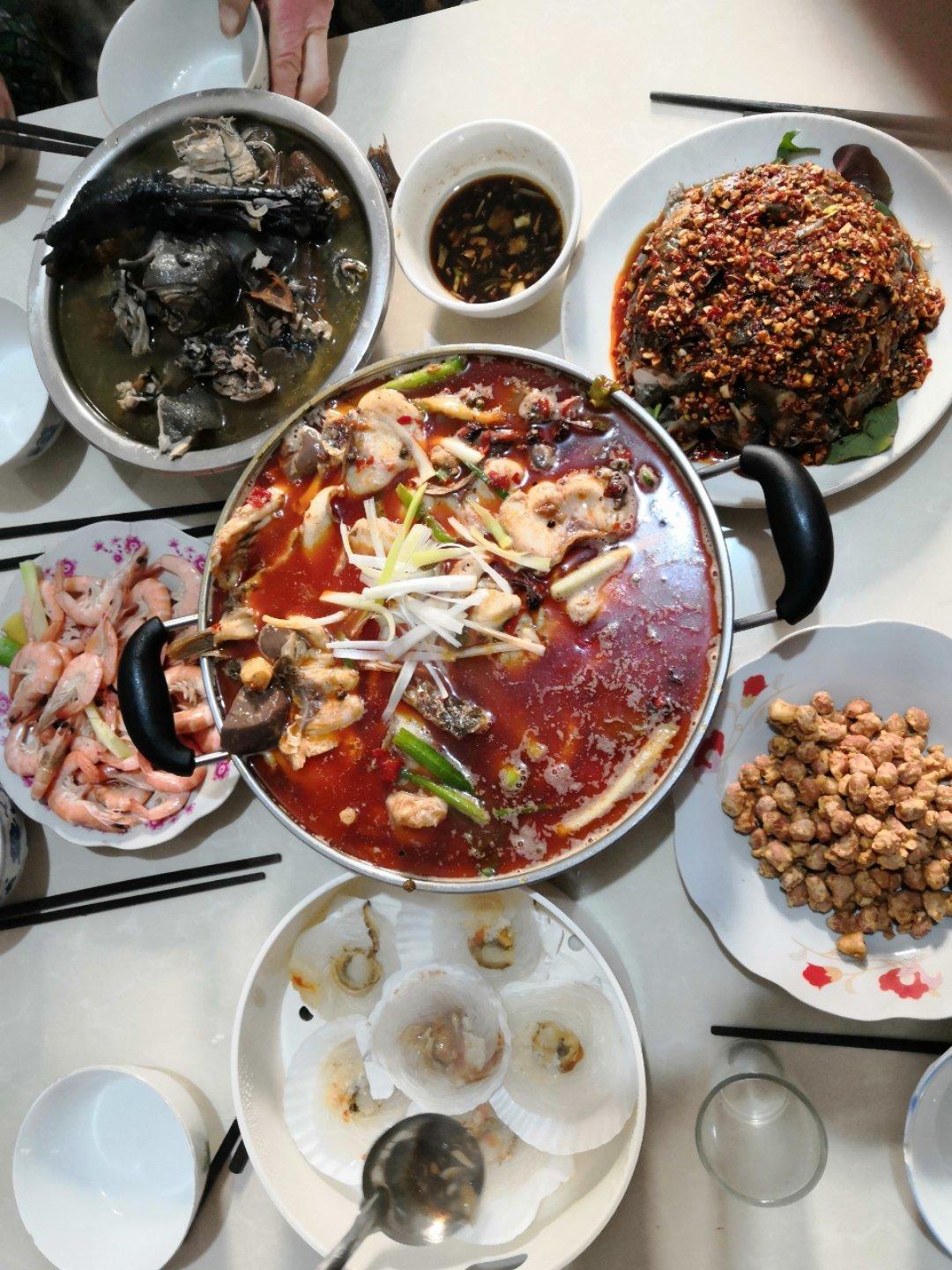 这是我家的年夜饭,清蒸扇贝,五香花生米,麻辣草鱼,凉拌土鸡,干竹笋鸡汤,白灼甜虾,红烧🐚