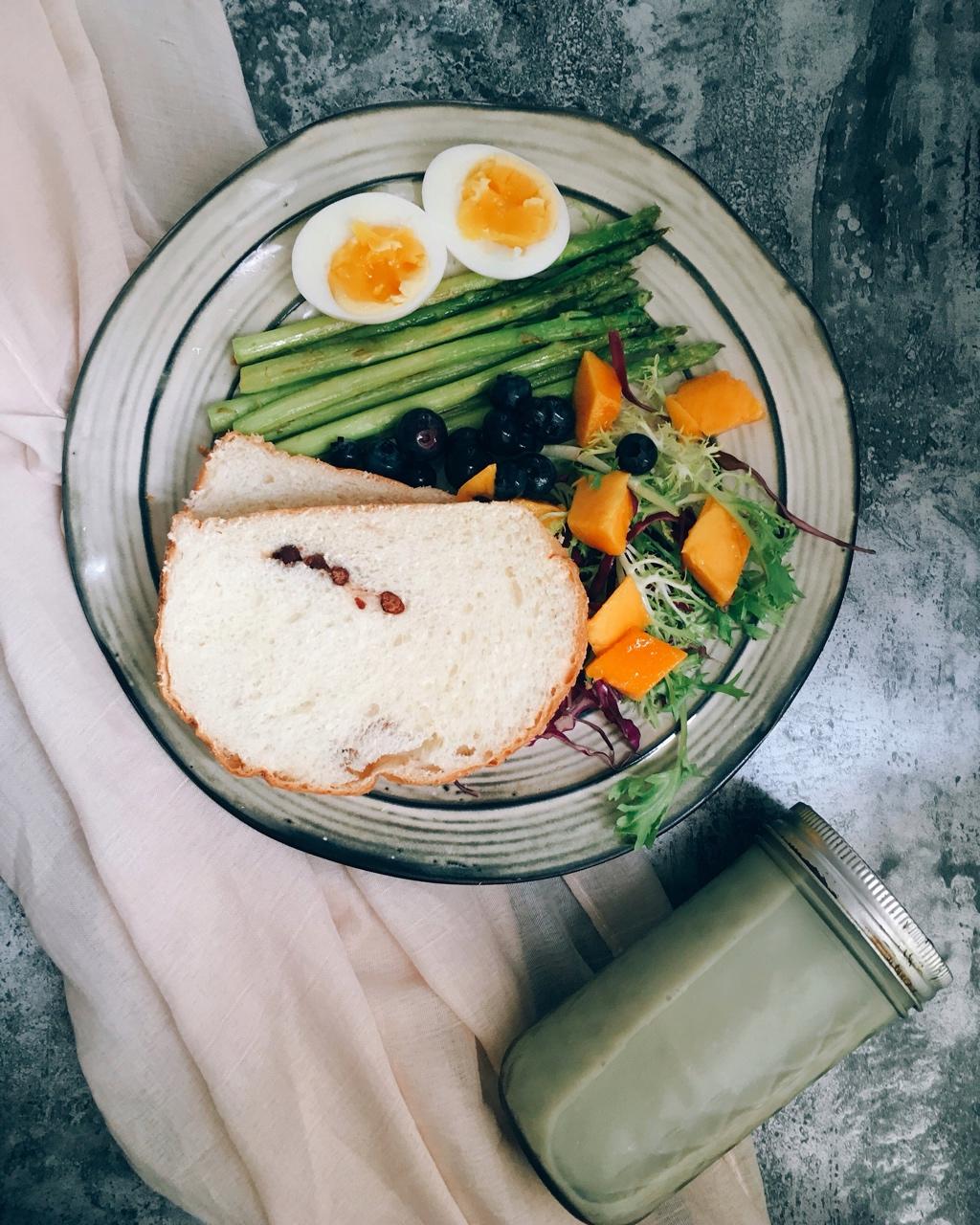 D24 土司+芦笋+水煮蛋+芒果蓝莓+黑豆浆。昨日练了臀,非常酸爽,最爱训练的部位没有之一(・◇・) #早餐•2018年...