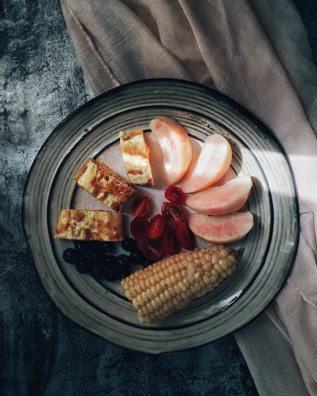 D25 芝士厚蛋烧+糯玉米+水果+黑豆浆(豆浆忘了拍( •̅_•̅ )